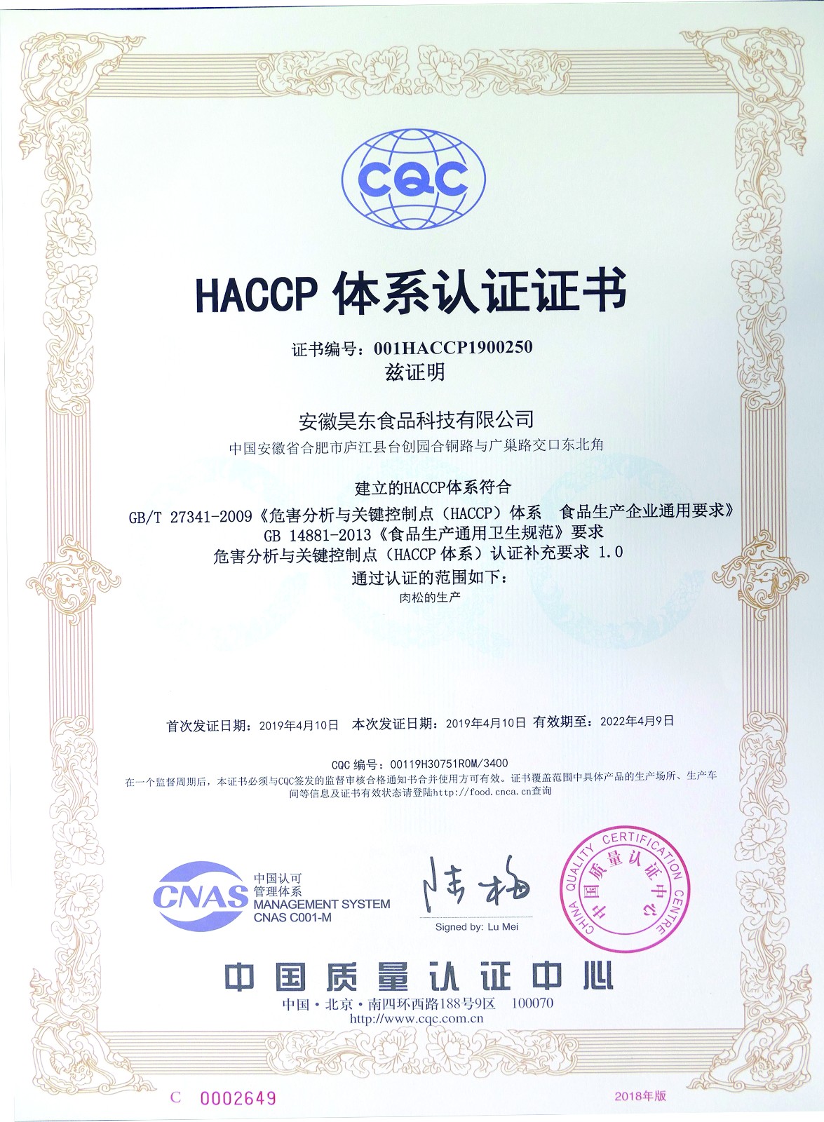 HACCP體系認(rèn)證證書(shū)