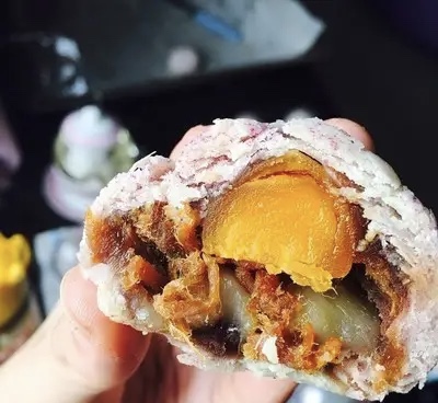 5.包好的面團用搟面杖搟成長條,從上往下卷起,再次搟成長條。兩次后搓成團備用。6.搟好的面團壓成面餅,依次放上準備好的昊東肉松、豆沙、麻薯、蛋黃包成球球,收口朝下。
